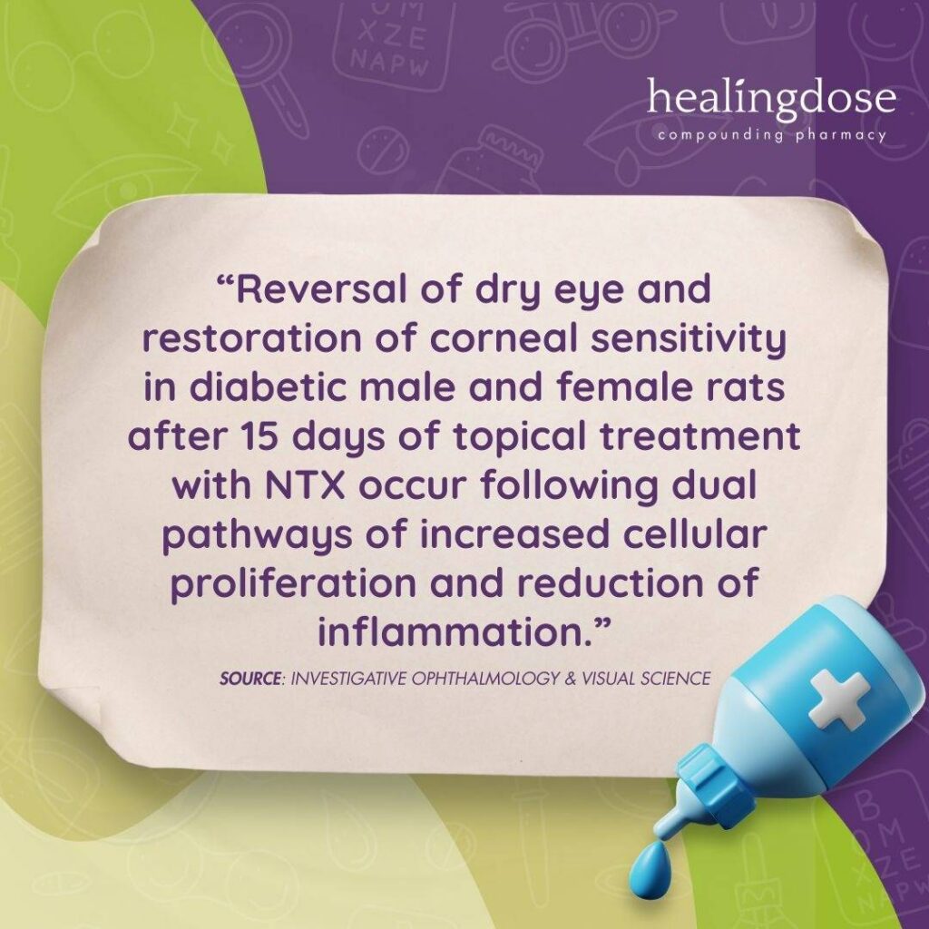 Diabetes is also associated with corneal neuropathy, characterized by reduced corneal sensitivity and impaired epithelial healing. Experimental studies have demonstrated that topical naltrexone administration restored corneal sensation toward non-diabetic levels in both type 1 and type 2 diabetic models.
