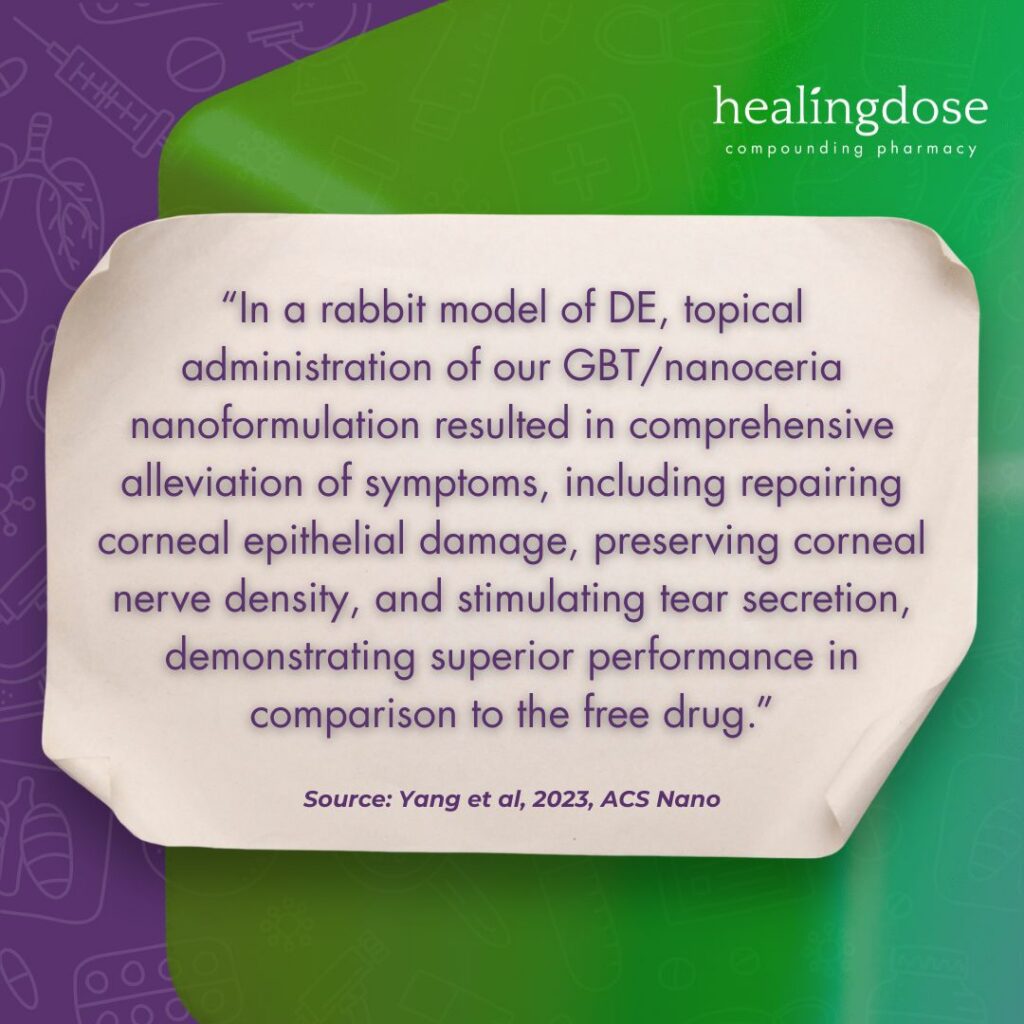- Yang, C., Anand, A., Huang, C., & Lai, J. (2023). Unveiling the Power of Gabapentin-Loaded Nanoceria with Multiple Therapeutic Capabilities for the Treatment of Dry Eye Disease. ACS Nano, 17(24), 25118–25135. Link